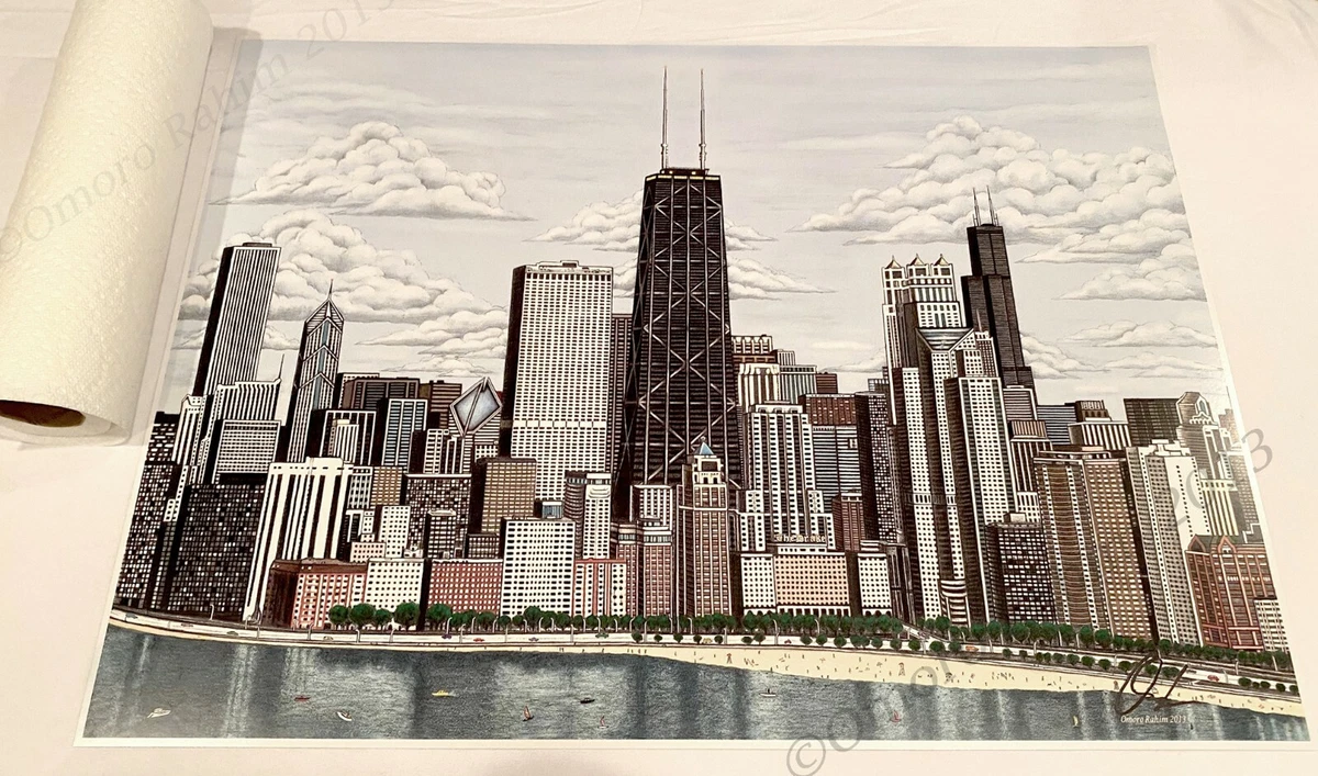 Chicago skyline drawing with Lake Michigan and Oak Street Beach